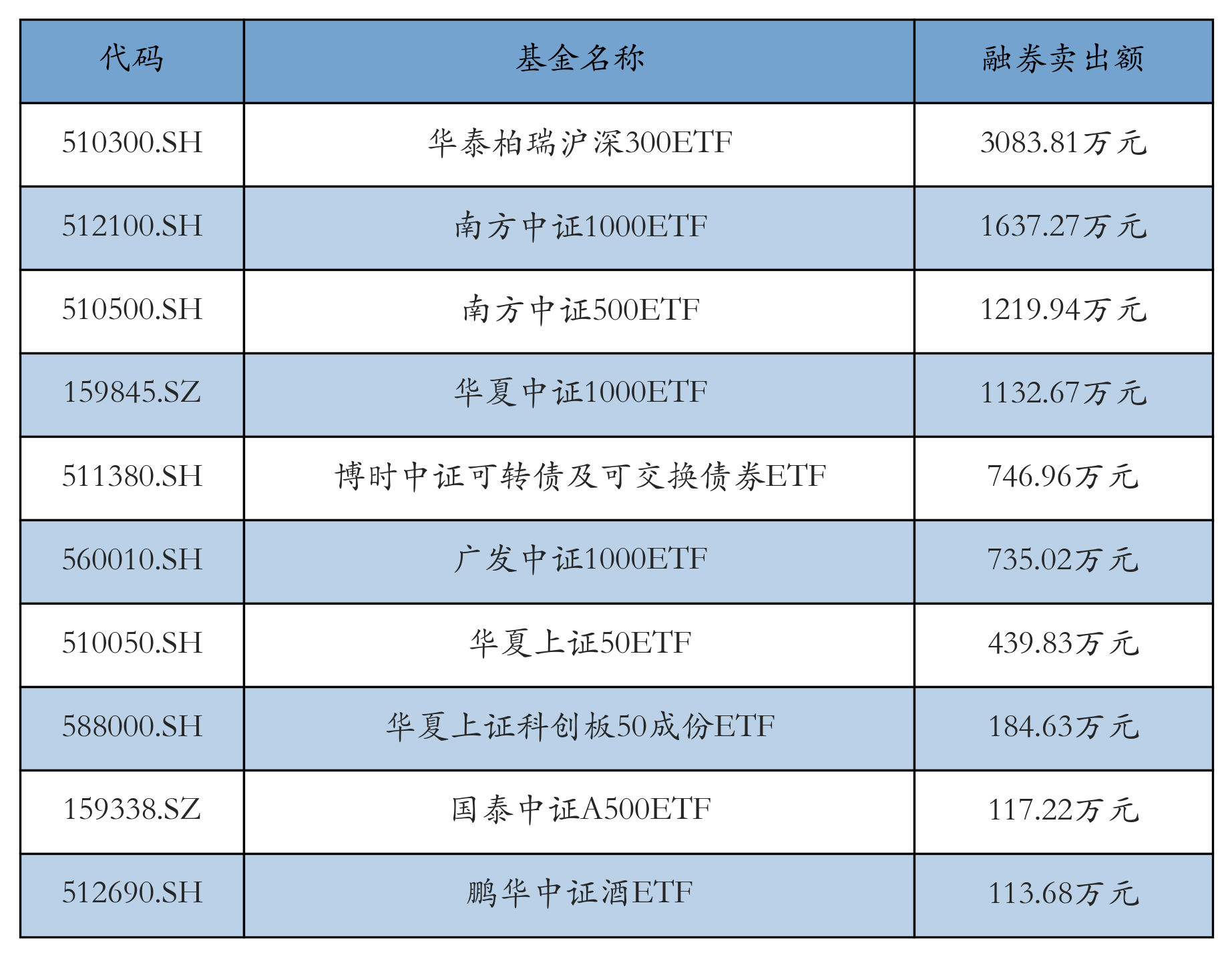 11月7日ETF融券卖出额前三位分别为:华泰柏瑞沪深300ETF(3083.81万元)、南方中证1000ETF(1637.27万元)和南方中证500ETF(1219.94万元)金股配资网,前10具体见下表: