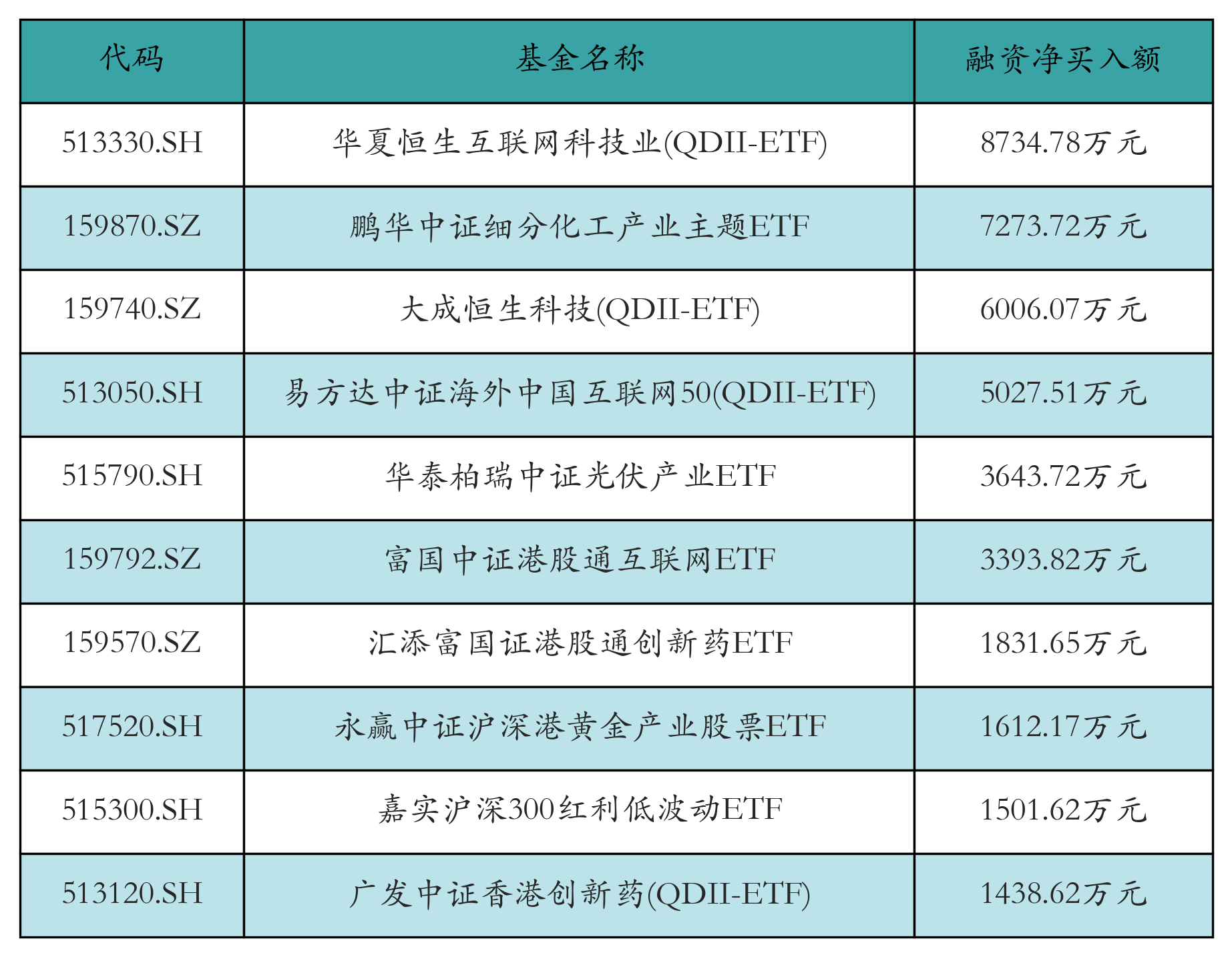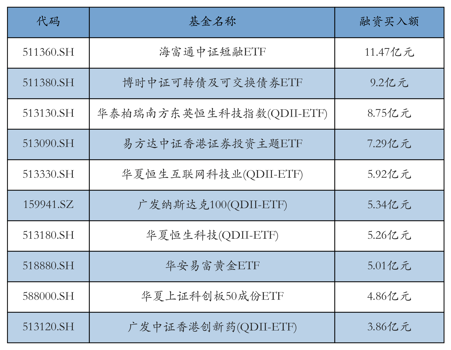 11月7日ETF融资买入额前三位分别为:海富通中证短融ETF(11.47亿元)、博时中证可转债及可交换债券ETF(9.2亿元)和华泰柏瑞南方东英恒生科技指数(QDII-ETF)(8.75亿元),前10具体见下表: