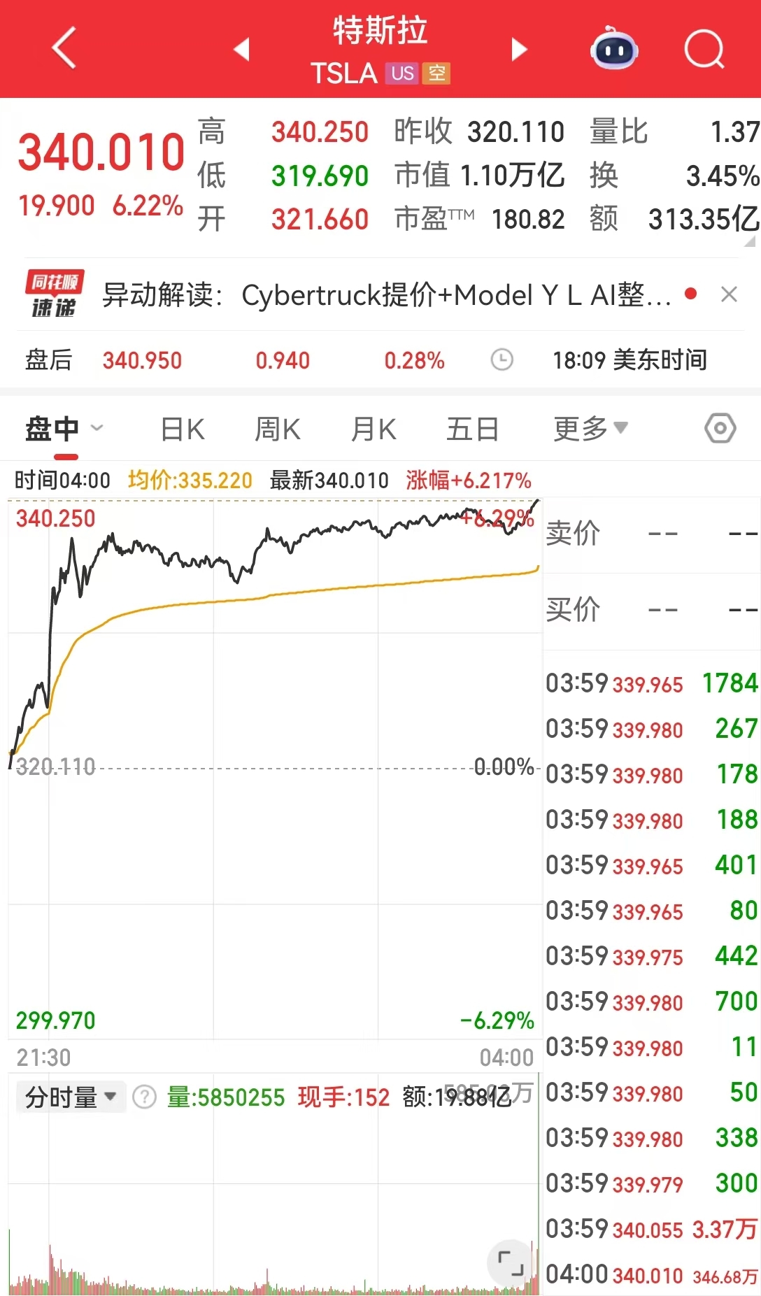 大型科技股普涨,特斯拉报340.01美元,涨6.22%,创2个月以来最大单日涨幅。其市值一夜增加642亿美元(约合人民币4600.38亿元)。