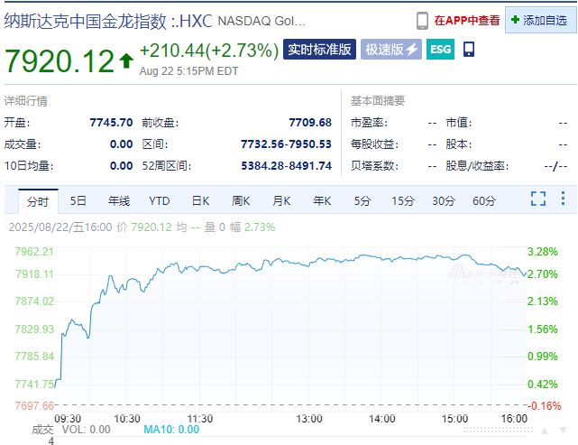 中国资产强势爆发,纳斯达克中国金龙指数收涨2.73%。