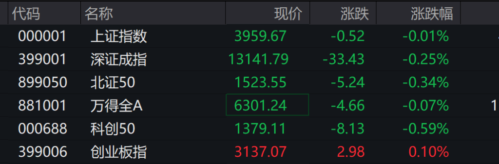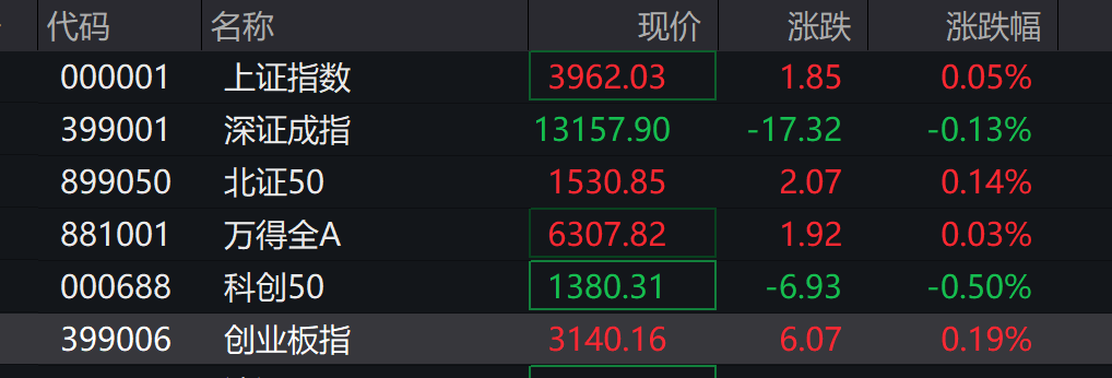 上证指数早盘收报3962.04点,涨0.05%。深证成指早盘收报13155.62点,跌0.15%。创业板指早盘收报3139.53点,涨0.17%。沪深300早盘收报4615.33点,跌0.07%。科创50早盘收报1379.94点,跌0.53%。中证500早盘收报7205.24点,跌0.08%。中证1000早盘收报7440.96点,涨0.07%。