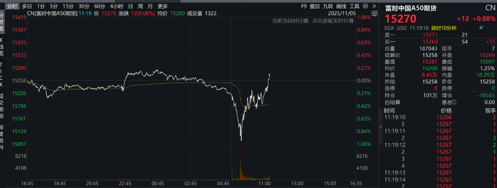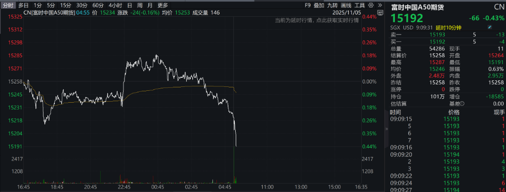 富时中国A50指数期货盘初跌0.31%,上一个交易日夜盘收跌0.24%。