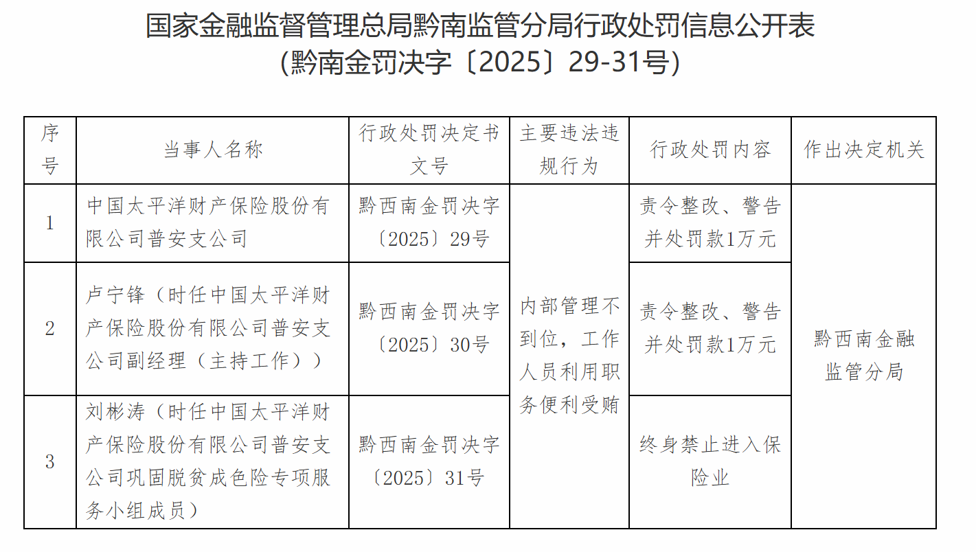 股票配资门户平台社区 太平洋财险普安支公司涉员工受贿被罚款1万元 责任人被行业终身禁入 股票配资门户平台社区 来源:汇巨摘配资 网站:辉煌优配官网 日期:2025-12-10 13:21:36 查看:63